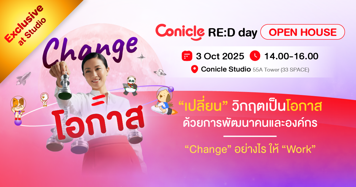 ท่ามกลางวิกฤตเศรษฐกิจ สภาวะสงคราม การเลิกจ้าง พนักงาน Burnout ทั้งองค์กรและคนทำงานจะไปต่อกันอย่างไร ร่วมหาทางออกเพื่อ “เปลี่ยน” วิกฤตเป็นโอกาสด้วยการพัฒนาคนและองค์กร ในงาน Conicle RE:D day [Live] EP4. Change Management & Reskill Beyond Crisis - “Change” อย่างไร ให้ “Work”