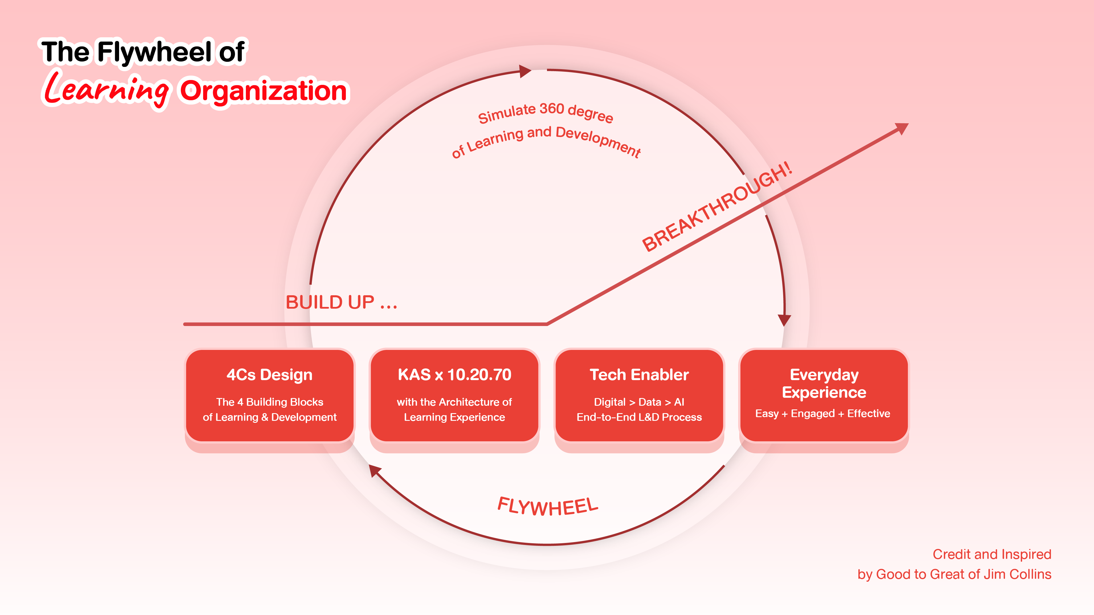 เมื่อองค์กรสามารถผสมผสานองค์ประกอบทั้ง 4 ด้านนี้เข้าด้วยกัน จะเกิด "The Flywheel of Learning Organization" ซึ่งเป็นกลไกที่ขับเคลื่อนให้องค์กรสามารถปรับตัว สร้างความได้เปรียบในการแข่งขัน และเติบโตอย่างยั่งยืนในระยะยาว